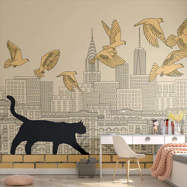 16.31 €9.79 €Fotobehang Kat loopt op een muur met vliegende vogels in de lucht