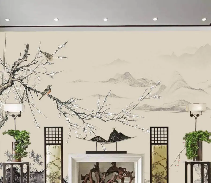 Fotobehang Schilderij van vogels op een tak