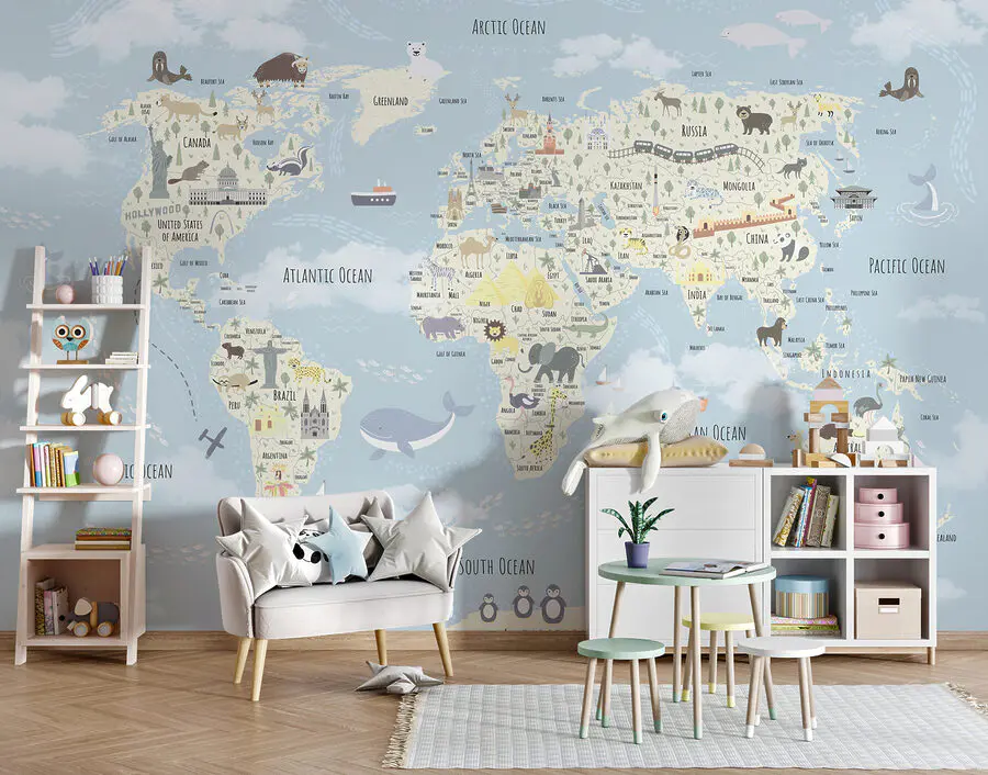 Breng de wereld in je kamer met deze charmante muurschildering "Een wereldkaart met dieren"! Het is een heerlijke traktatie voor kinderen en perfect voor kinderkamers of speelzalen. Stel je de opwinding van je kleine ontdekkingsreiziger voor, die voor het slapengaan schattige dieren van elk continent ziet. Het is niet alleen educatief, het is als een speels avontuur bij je thuis. Omarm het knusse gevoel van de zachte kleuren en grillige ontwerpen. Of je nu gek bent op aardrijkskunde of houdt van een unieke inrichting, deze muurschildering tovert zeker een glimlach op gezichten van jong en oud.
