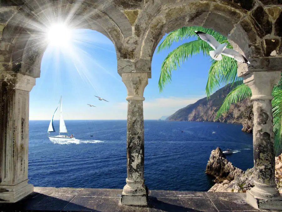 Fotobehang Uitzicht op de oceaan vanuit een stenen boog