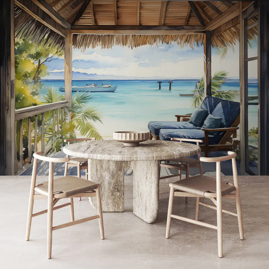Fotobehang Aquarel van een strand met stoelen en een boot